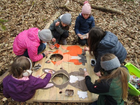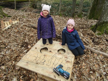 Warm angezogen, mit selbst bemalten Sitzkissen unter dem Hintern und Tee im Gepäck ließ es sich prima aushalten und störte auch der ein oder andere Regentropfen nicht. Emsig und mit viel Freude und guter Laune wurden Foto-Aufsteller durch Bohren, Sägen und Schleifen präpariert und im Anschluss liebevoll angemalt.