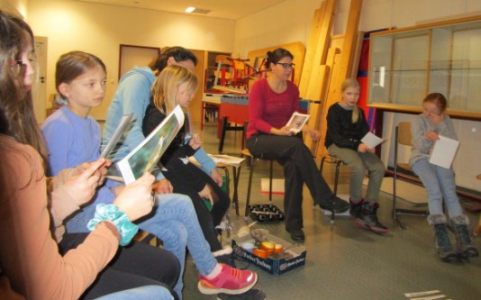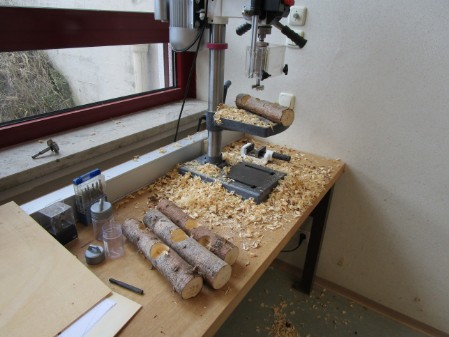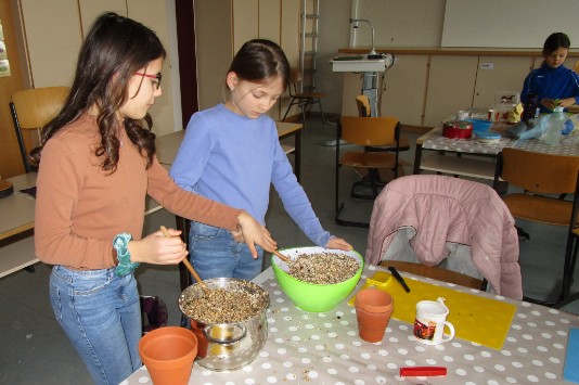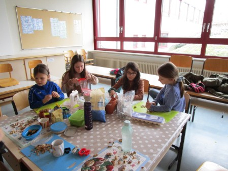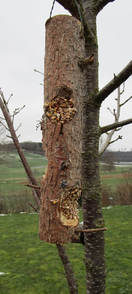 Beim ersten Treffen wurde eine Vogelfutter-Station gebaut, indem ein Holzstamm zurechtgesägt und mit Löchern angebohrt wurde. In die Löcher füllt man Futter, das beim zweiten Treffen hergestellt wurde. Damit die Vögel sich gut festhalten können, wurden unter die Löcher noch kleine Ästchen gesteckt.