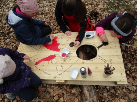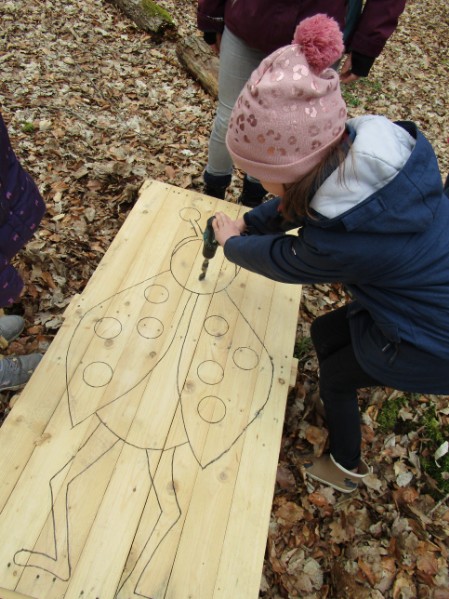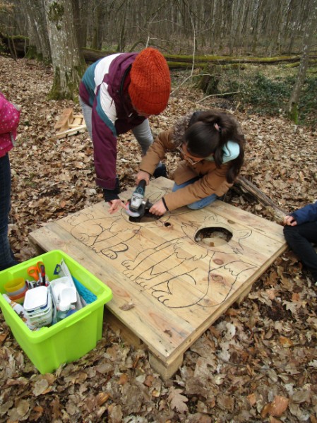 Warm angezogen, mit selbst bemalten Sitzkissen unter dem Hintern und Tee im Gepäck ließ es sich prima aushalten und störte auch der ein oder andere Regentropfen nicht. Emsig und mit viel Freude und guter Laune wurden Foto-Aufsteller durch Bohren, Sägen und Schleifen präpariert und im Anschluss liebevoll angemalt.